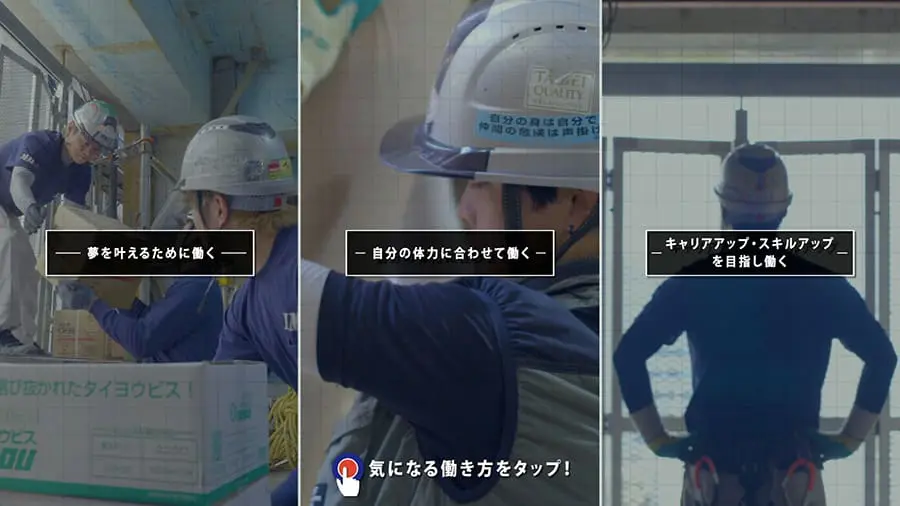 映像は、社員一人ひとりのインタビューや仕事風景を収録し、求職者が自身の価値観や働き方に近いコンテンツを選んで視聴できる構成に。一人称視点の導入により、まるで自分が出社しているかのような没入感を演出しています。